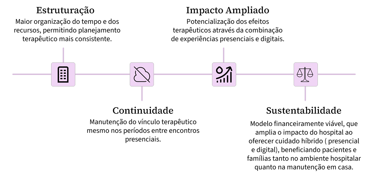 Esta proposta adota uma estrutura híbrida que combina interações digitais e presenciais. O objetivo é oferecer uma abordagem integrada e fluida, para potencializar os efeitos terapêuticos junto às crianças e suas famílias.